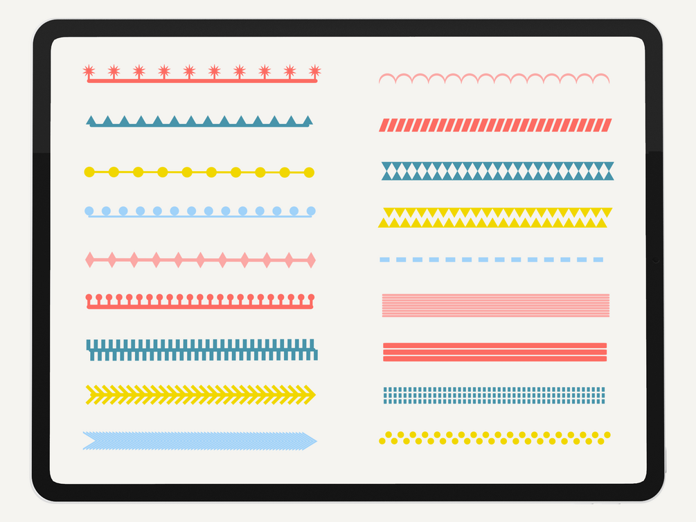 Liners and Borders Procreate Brushes are a great way to add interesting details to illustrations, art, professional designs or creating distinct lines, borders and boxes around areas. Brushes and shapes have been created in Adobe Illustrator and turned into Procreate Brushes which means they are very high quality!