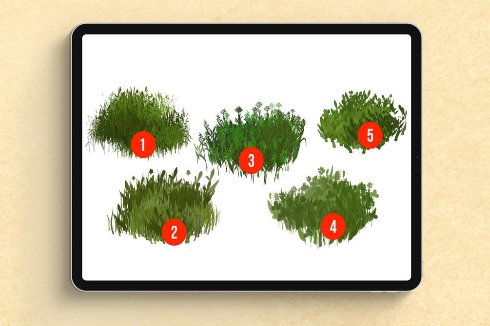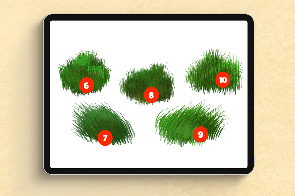 Add grass the fast way! These grass brushes have pressure sensitive opacity: the lighter you press means more transparent the leaves. In such way you can stack the color with stronger pressure.