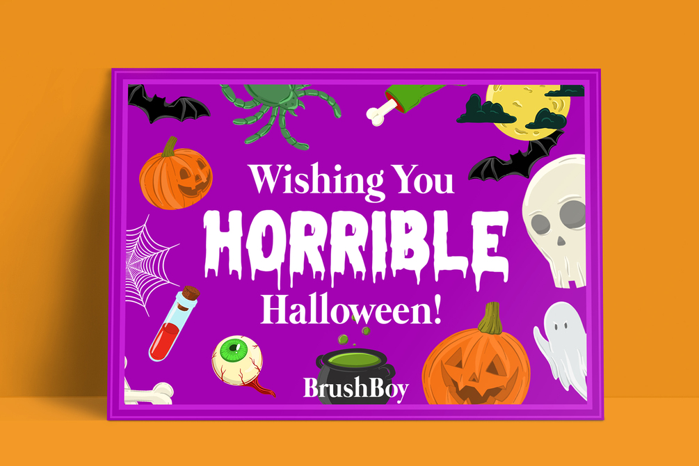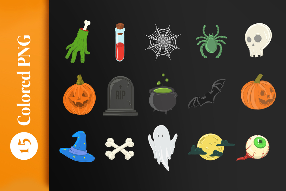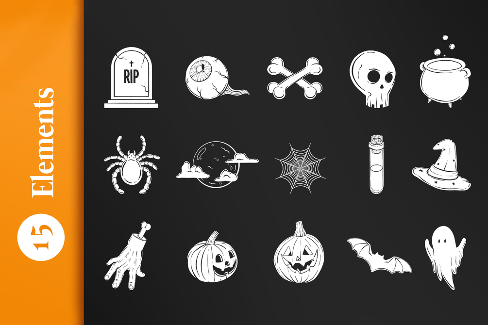 🎃 Two carved pumpkins, 👻 Ghost, 🦇 Bat, 🌕 Full Moon, 🧟♀️ Walking Hand, 🕷️ Spider, 🕸️ Spiderweb, 💀 Skull, 🦴 Bones, 🧙 Magic Hat, ⚰️ Tombstone, 👁️ Eyeball, 🍲 Cauldron and a 🧪 Health Potion.